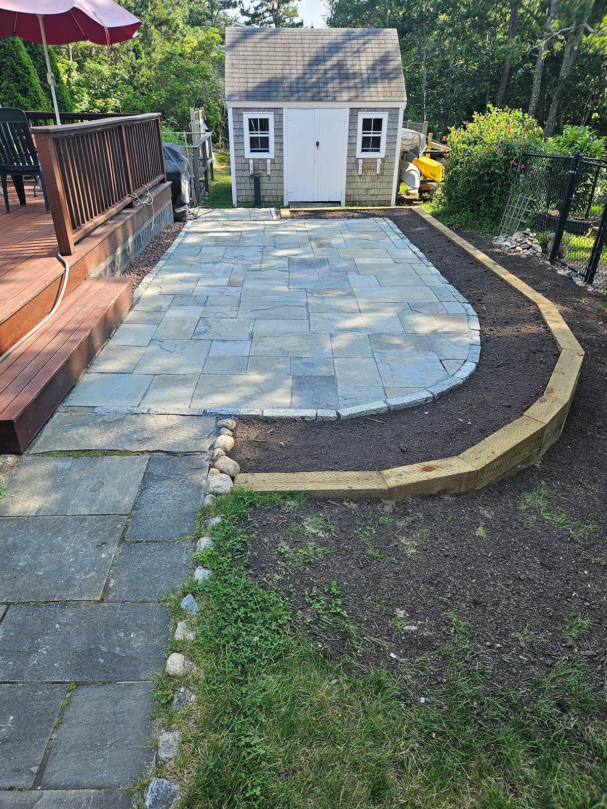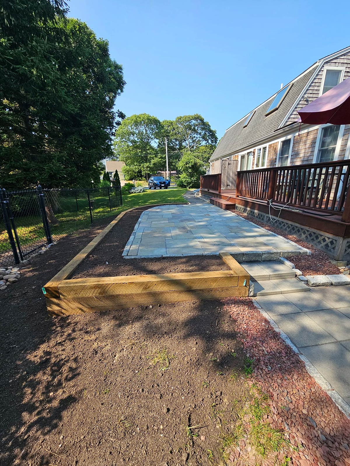 This Eastham backyard was transformed into a functional and inviting outdoor living space featuring a new flagstone patio, granite edging, and a landscape timber retaining wall with raised garden beds.