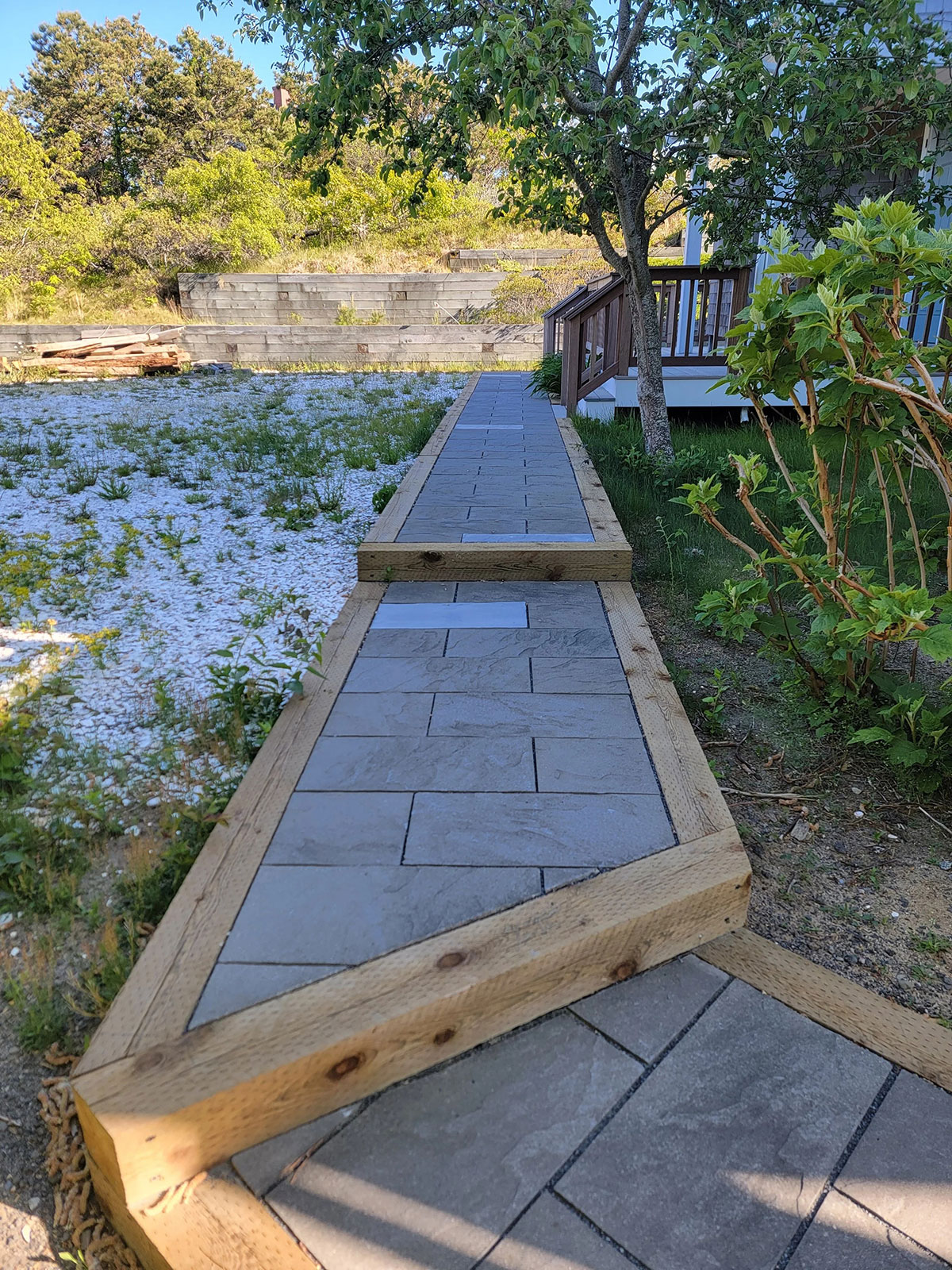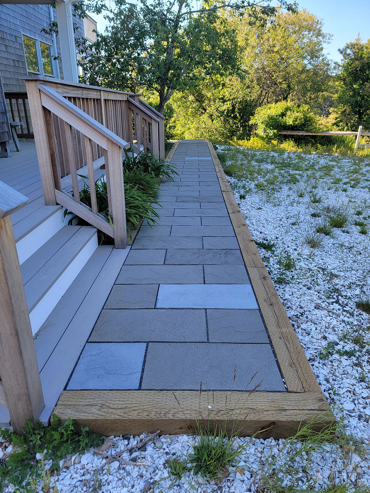 The walkway was built using a flagstone pattern paver system framed with pressure-treated landscape timbers for clean, defined edges and long-term stability. Multiple elevation changes were carefully addressed with stepped transitions, ensuring a seamless flow between the two porch landings. New plantings were added between the stairs to soften the space and integrate the hardscape with the surrounding landscape.