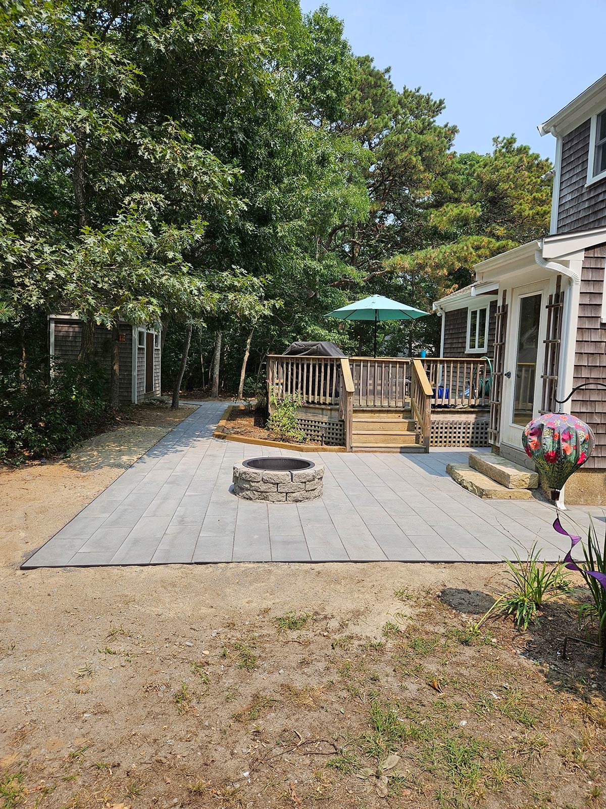 This Orleans property was transformed into a cohesive outdoor living space featuring a refreshed shell driveway, a new flagstone walkway, raised planting beds, and a custom-built patio with fire pit—creating seamless connections from front to back.